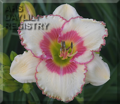 | Description : cream with rose pink eye and edge above green throat | |