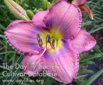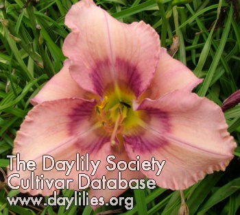 | Description : flesh with heliotrope red violet patterned eye above chartreuse throat | |