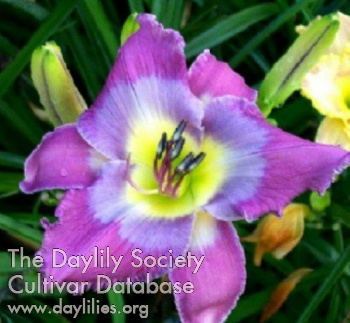 | Description : lavender, small blue and gold edge, large blue eye, halo type green to gold throat | |