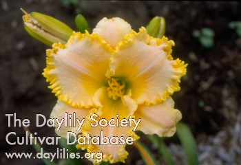 | Description : waxy pale pink self with a green throat and a gold ruffled edge | |