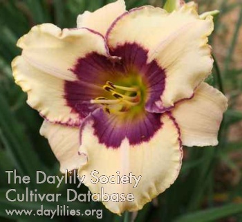 | Description : rose pink petals and sepals with vivid blue violet eye outlined in burgundy wine, triple edge of burgundy wine, blue violet and white, yellow to green throat | |