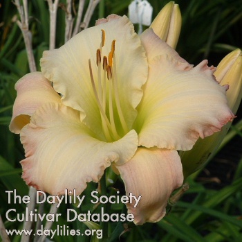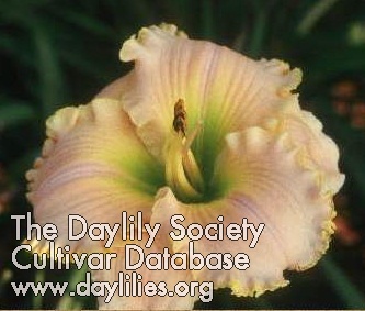 | Description : very light pink yellow polychrome with ruffled yellow edge and green throat | |