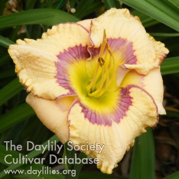 | Description : amber rose with fuchsia, green lavender and purple rings of color in the eye with deep emerald green throat | |