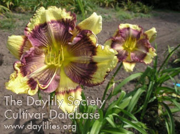| Description : frosted butter cream with an orchid violet patterned eye and matching light picotee edge, green yellow throat | |