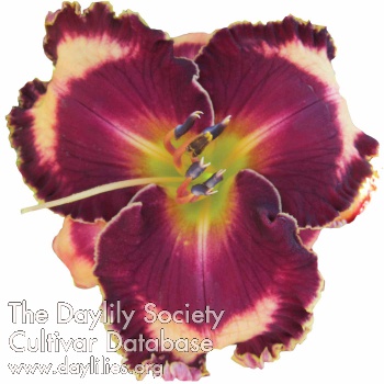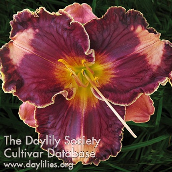| Description : Dusty rose with large eye, inner edge is dark garnet with outer edge of gold, green throat is streaked with color. | |