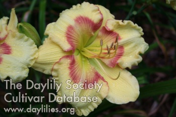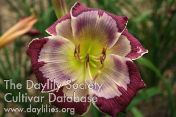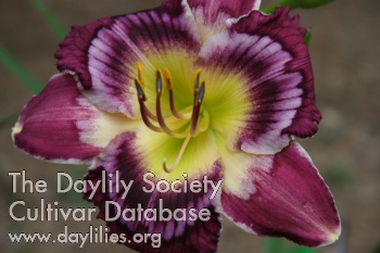| Description : Flesh pink with wine purple eye and lime green throat, with white toothy edge. | |