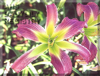 | Description : fuchsia orchid rose blend with darker veins on the petals with intense neon lime green throat outlined with a creamy white edge | |