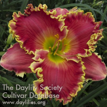 | Description : Pink with a yellow and green throat, distinctive yellow stripes, and yellow edge. | |