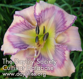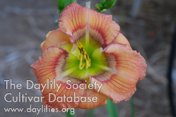 | Description : reverse bicolor with amber petals and rose sepals, multicolored patterned eye of rose fuchsia, lavender, chartreuse yellow and charcoal, with rose veining and midribs on petals | |