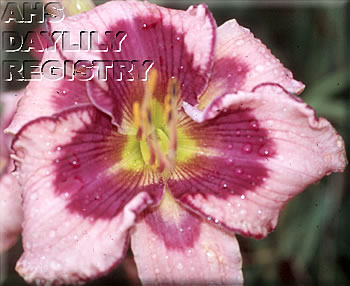 | Description : pale lavender off white with large patterned eye of multiple bands of purple, fuchsia, and magenta on all segments, and green throat | |