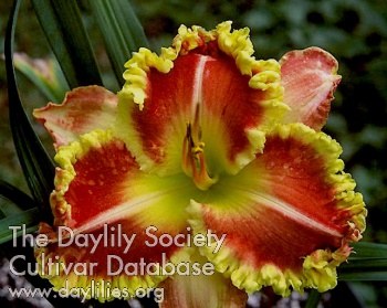 | Description : Carmine red with high contrast white teeth and knobs, and yellow green throat. | |