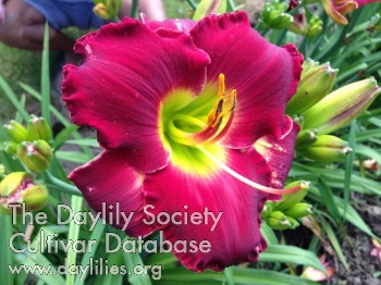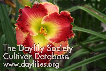 | Description : Ruffled, bright, sunfast red with vivid green throat. | |