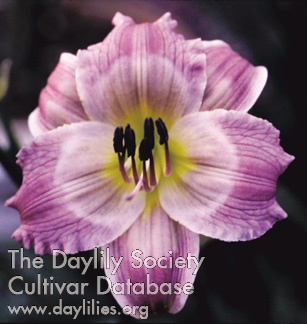 | Description : dusky rose base with large eyezone in bluish purple outlined in raspberry, large green throat, edged in raspberry, purple and silver | |