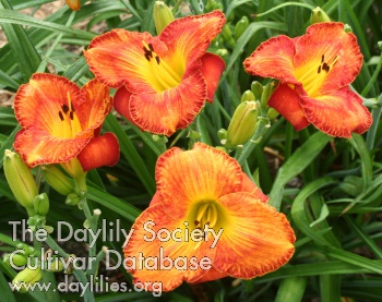 | Description : Heavy red stipples over a peach base with a triangular yellow to green throat. | |