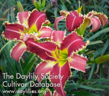 | Description : Red with white watermark, white toothy edge, and green throat. | |