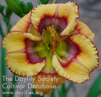| Description : Amber with multiple rings of many colors including purples, blues, grays, and lavenders, with acid green throat. | |